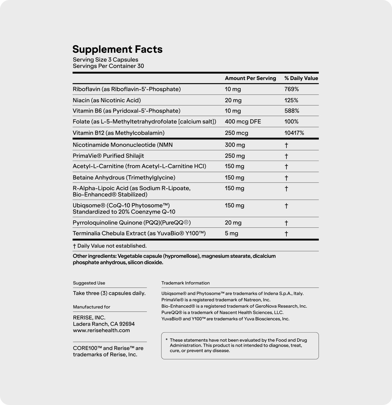 Take three capsules once per day, at roughly the same time each day. Core100 is designed as a simple, once-daily routine so you’re more likely to stay consistent over 90 days and beyond. You don’t need to split the dose. Most people choose morning use so they can track how energy and focus feel across the day. Always follow the label instructions on your bottle.